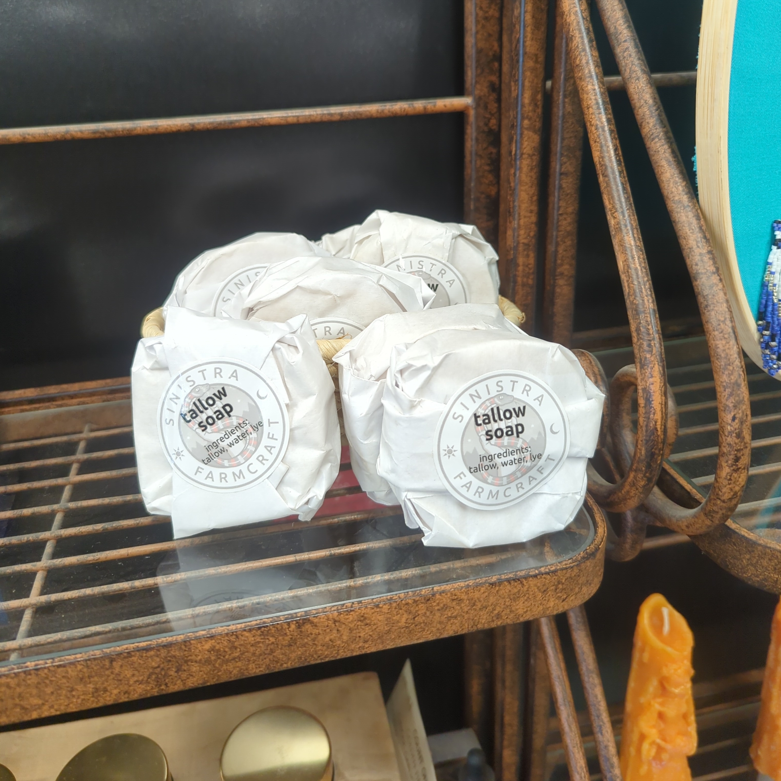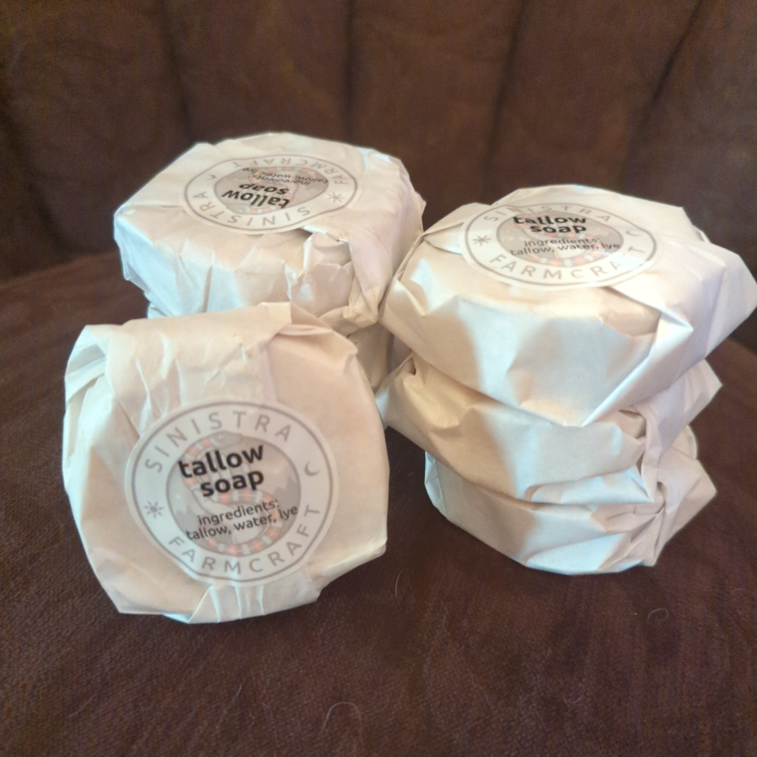 ShepherdScrub Soap is made from sheep tallow, lye, and water in batches of 10 bars at a time. Some ShepherdScrub varieties contain an abrasive such as coffee grounds, or ground rosemary, for those times when one needs some serious scrubbing after a dirt filled day on the farm. Similarly, some varieties have extra tallow for moisturizing.